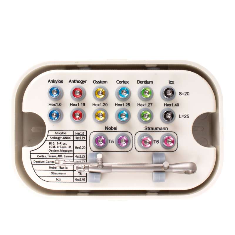 - Componentes completos: El kit incluye un conjunto completo de herramientas y accesorios necesarios para apretar y aflojar los tornillos clínicos y protésicos en los implantes dentales.