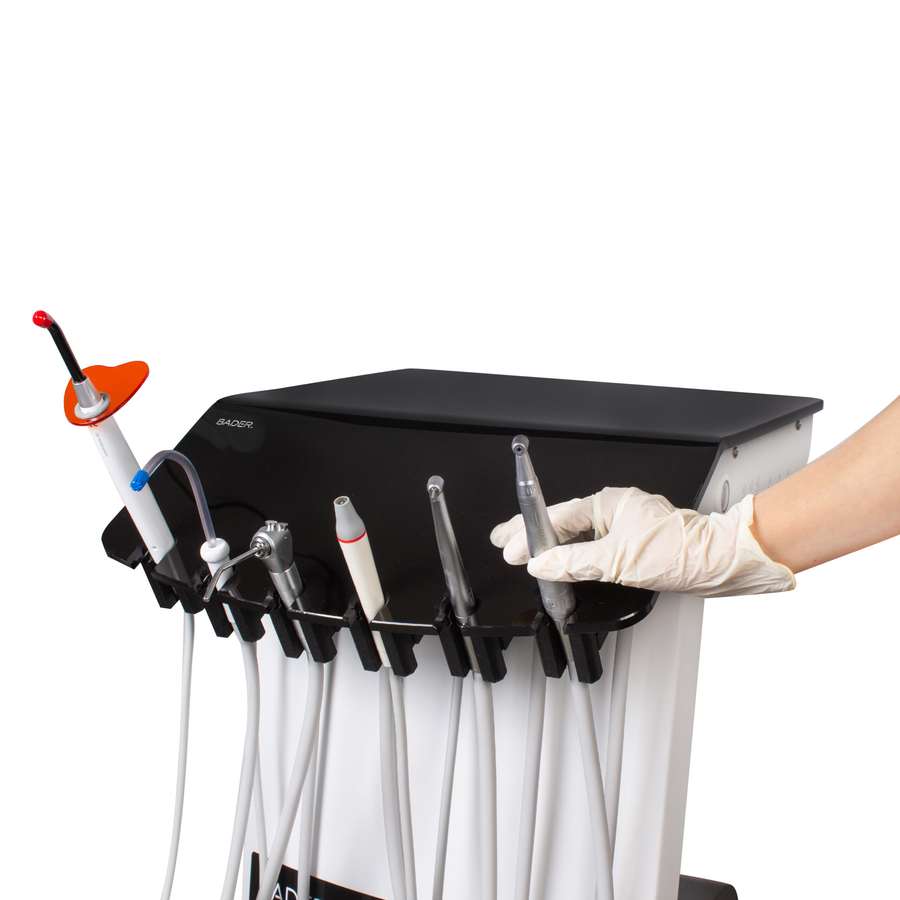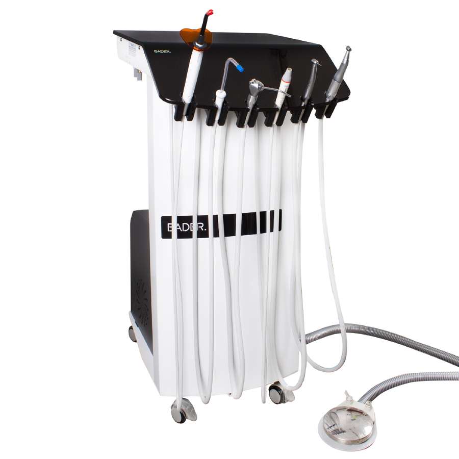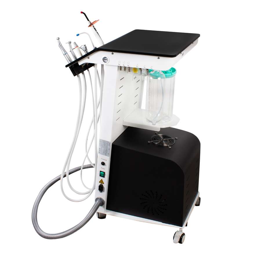 El Carrito con compresor equipado con: micromotor, turbina, aspiración, jeringa triple, lámpara de fotocurado y ultrasonido. Además, cuenta con control mediante pedal, lo que facilita una manipulación ergonómica y sin interrupciones.