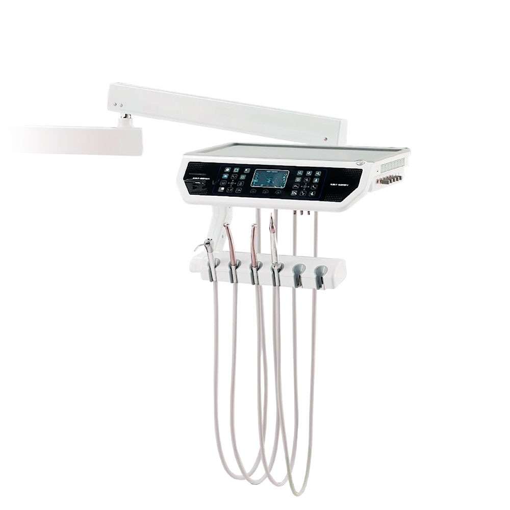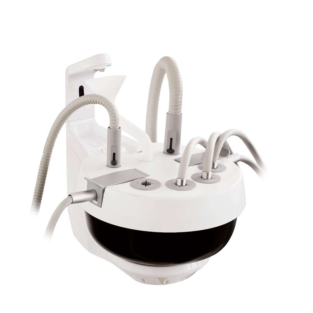 - 4 Mangueras: Jeringa triple (Aire, agua, spray), 1 lámpara de polimerizar, 2 mangueras de aspiración tipo Cattani con cánulas quirúrgicas y eyector de saliva.