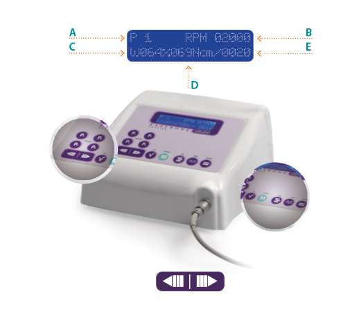 - Funciones programables de acceso directo: velocidad, torque, bomba, reversa, pieza de mano reductora (todos los parámetros en modo secuencial).